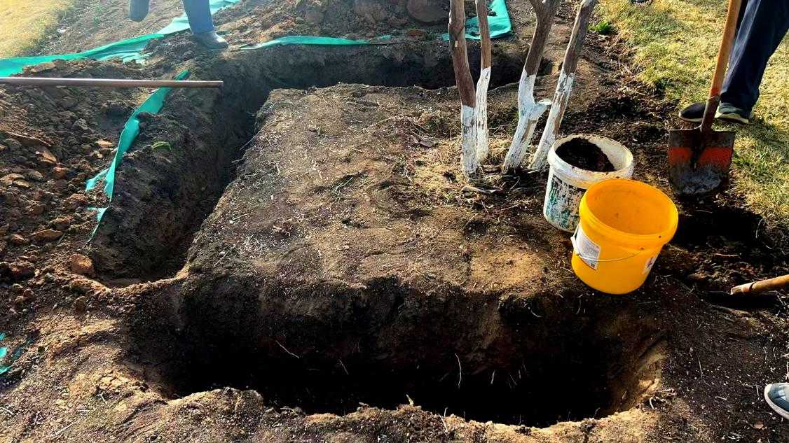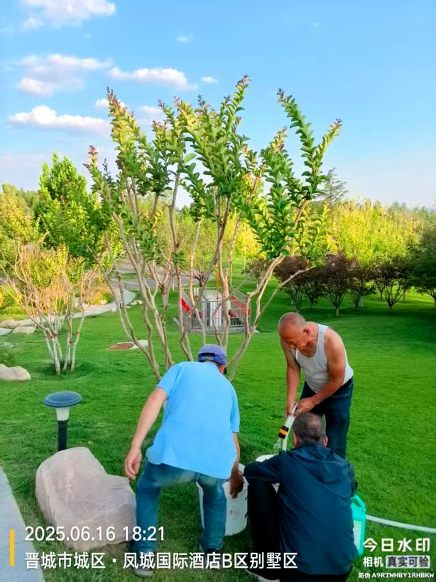 示范區(qū)土壤有點(diǎn)偏堿、板結(jié),紫薇根系“吃不好”。師傅們在樹干旁挖了環(huán)形溝,埋上沙土+有機(jī)肥,像給土壤“松綁”;再分層撒上復(fù)合肥+藥肥,灌透定根水,讓養(yǎng)分慢慢釋放。這波操作下來,根系終于能“大口呼吸”了!