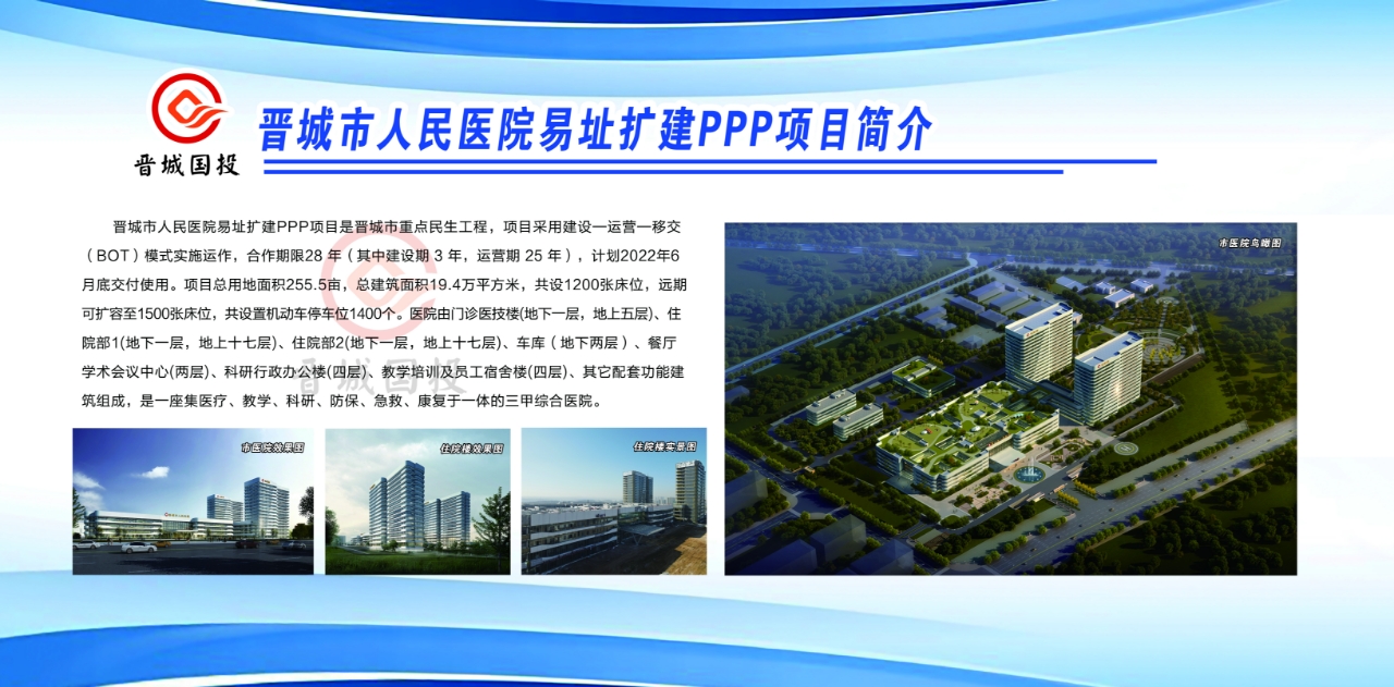 晉城市人民醫(yī)院易址擴(kuò)建PPP項(xiàng)目是晉城市重點(diǎn)民生工程,項(xiàng)目采用建設(shè)—運(yùn)營(yíng)—移交(BOT)模式實(shí)施運(yùn)作,合作期限28年(其中建設(shè)期3年,運(yùn)營(yíng)期25年)。項(xiàng)目總用地面積255.5畝,總建筑面積19.4萬(wàn)平方米,共設(shè)1200張床位,遠(yuǎn)期可擴(kuò)容至1500張床位,共設(shè)置機(jī)動(dòng)車停車位1400個(gè)。醫(yī)院由門診醫(yī)技樓(地下一層,地上五層)、住院部1(地下一層,地上十七層)、住院部2(地下一層,地上十七層)、車庫(kù)(地下兩層)、餐廳學(xué)術(shù)會(huì)議中心(兩層)、科研行政辦公樓(四層)、教學(xué)培訓(xùn)及員工宿舍樓(四層)、其它配套功能建筑組成,是一座集醫(yī)療、教學(xué)、科研、防保、急救、康復(fù)于一體的三甲綜合醫(yī)院。